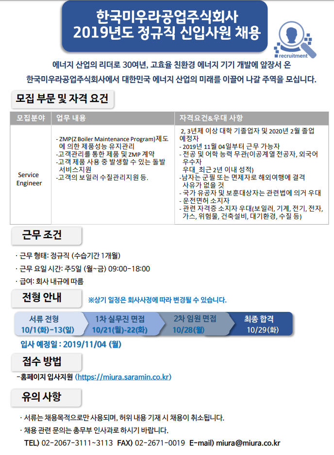 (~10/13)[한국미우라공업주식회사] 2019 정규직 신입사원 채용 안내 글의 상세내용