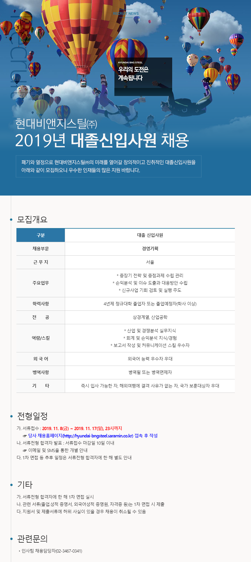 (~11/17) [현대비앤지스틸㈜] 2019년 대졸신입사원 채용 안내 글의 상세내용