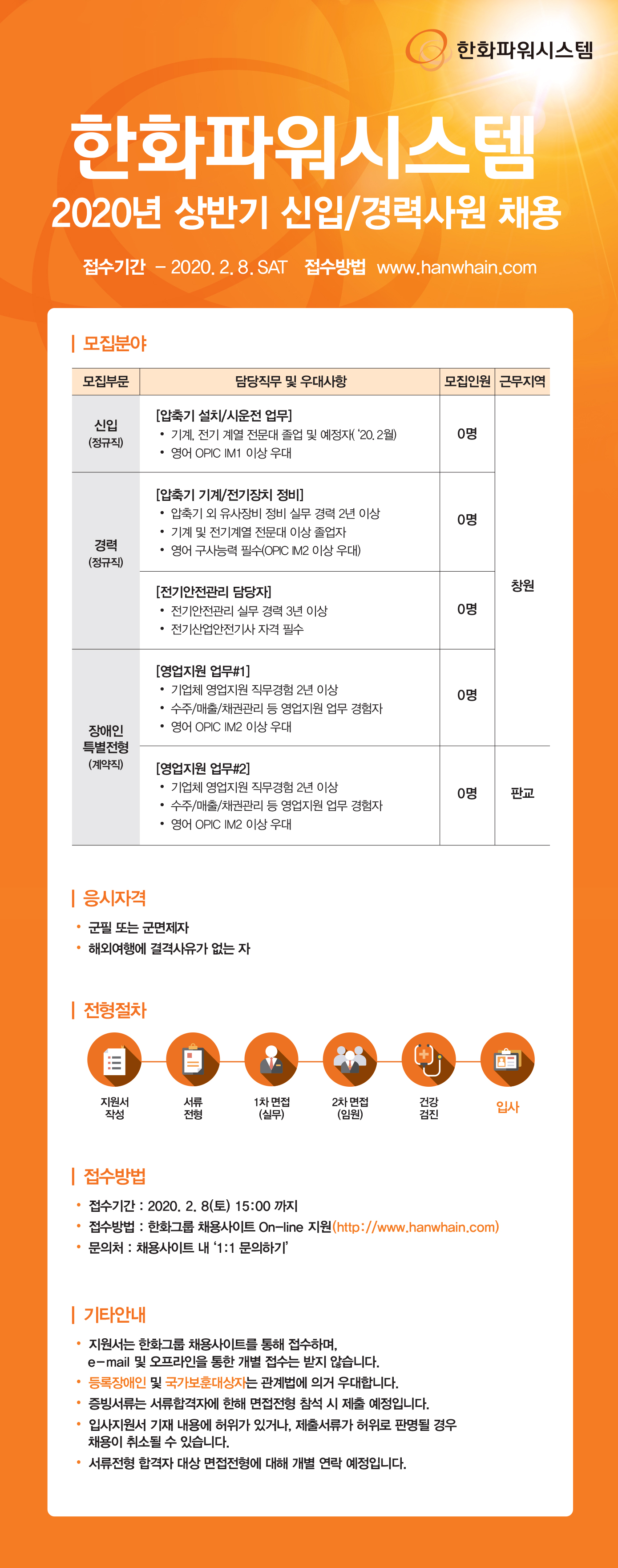 제목 (~2/8) [한화파워시스템] 2020 상반기 신입사원/경력사원 채용 안내